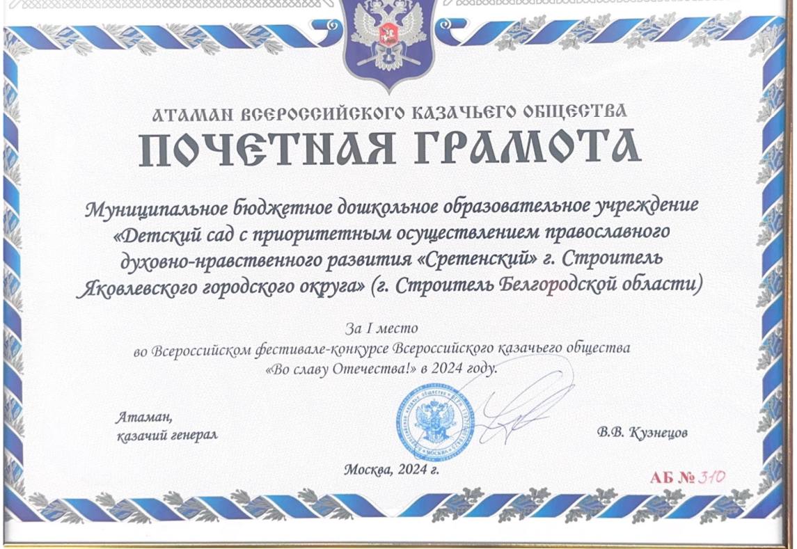 Коллектив православного детского сада «Сретенский» награжден почетной грамотой Всероссийского казачьего войска