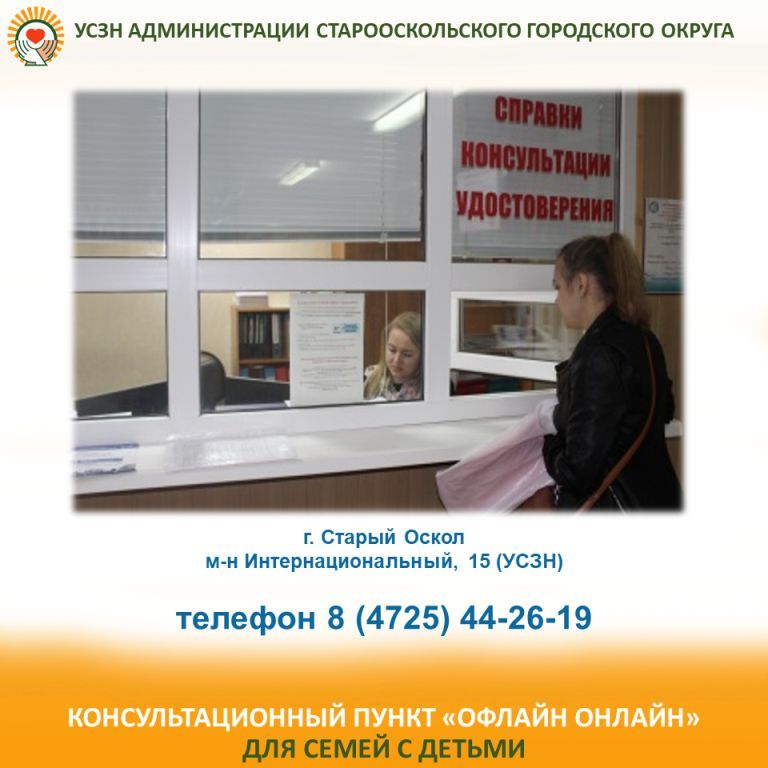 Консультацию офлайн можно получить по адресу: г. Старый Оскол, м-н Интернациональный, 15 (управление социальной защиты населения администрации Старооскольского городского округа) или по телефону 8 (4725) 44-26-19.