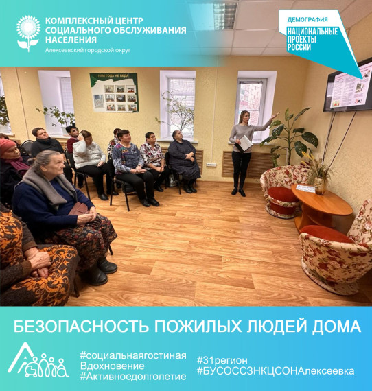 В рамках регионального проекта "Старшее поколение" национального проекта "Демография" в отделении дневного пребывания для граждан пожилого возраста и инвалидов проведено мероприятие, посвященное безопасности пожилых людей в домашних условиях.