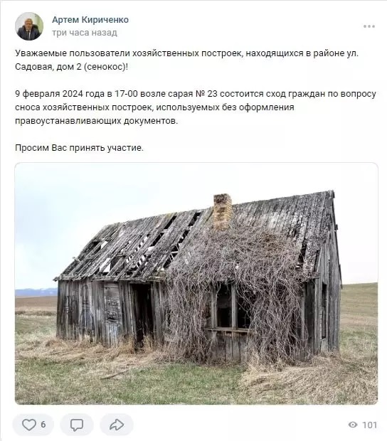 Глава Тавровского сельского поселения Артём Кириченко на своей странице «ВКонтакте» назначил жителям встречу, но выбрал для этого необычное место — сарай на улице Садовой. Таким образом Кириченко, похоже, решил привлечь внимание селян к проблеме с хозяйственными постройками, которыми пользуются люди, не узаконив их. Более того, свою публикацию он сопроводил фотографией сарая. Использовал ли он для этого реальное фото строения № 23, или же рандомное фото из интернета — неизвестно.