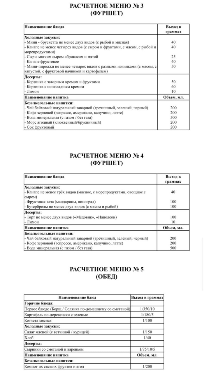 В рамках технического задания предусмотрено шесть видов фуршетного меню, а также два варианта обедов и ужинов. Гостям предложат широкий выбор блюд: от шашлыков и пирожков до мясных и рыбных деликатесов, свежих салатов, десертов и фруктов. Из напитков в меню чай, кофе, лимонады, морсы и соки.