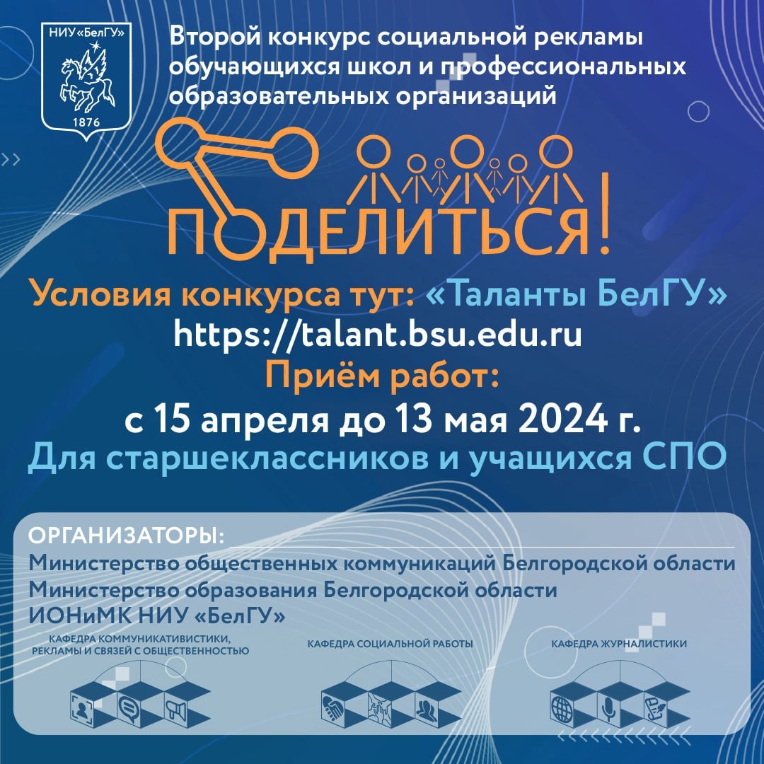 НИУ «БелГУ» запустил конкурс социальной рекламы под названием «Поделиться!». Его цель — привлечь школьников старших классов и обучающихся на программах среднего профессионального образования к продвижению семейных ценностей, патриотизма и добровольчества в обществе.